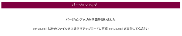 - バージョンアッププログラムは元に戻せるよう処理を行なっていますが万が一の為にバージョンアップをする前にはインストールしているディレクトリを丸ごとバックアップをとるなどして、元に戻せるように準備してから実行してください。